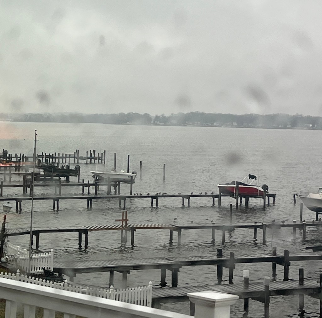 As I stood by the glass doors overlooking the river I noticed the mallards out there on the water. Two docks have ducks lined up, either huddled together or nestled down in their feathers by themselves. A few of the ducks are swimming around in the water between the docks. There is one little guy floating alone yet another dock over. Perhaps he is pondering the day out there away from the others. Do waterfowls think or just follow instincts? There’s community out there on this rainy day. Even the one off to himself is not too far away from all the others.
