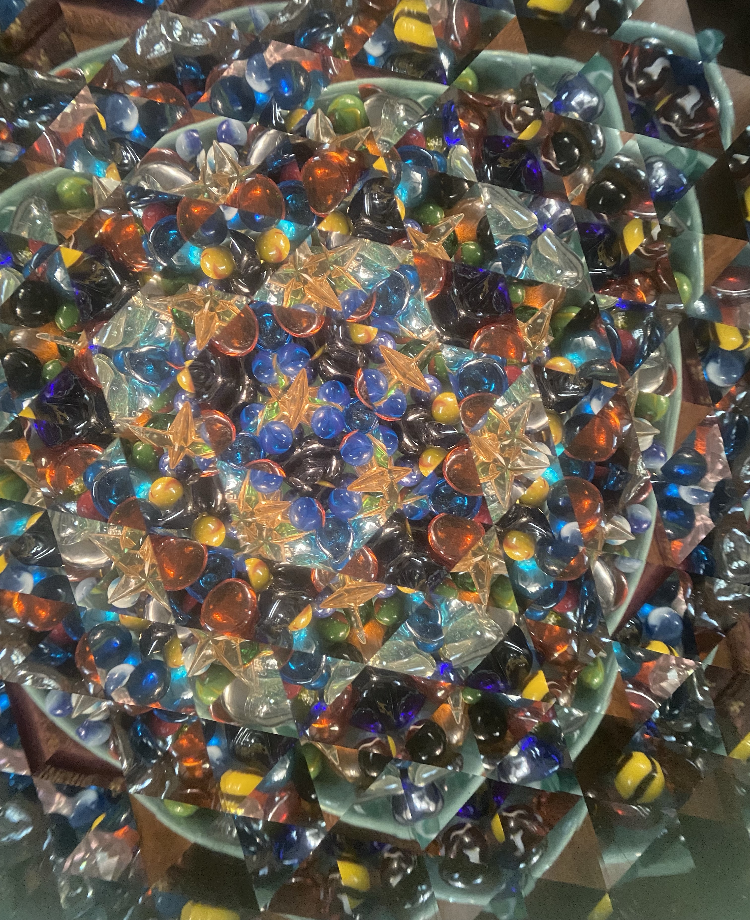 Ever felt like this trying to sit still and quiet the mind? It feels like a million pieces of glass from a million different places clanking around in there. I’ve written about our life mosaics and their beauty unfolding as each new episode of our story reveals itself. Those are events minute and enormous that define us and our journey. It is however the kaleidoscope of our minds that make up everyday living and feeling. All those hundreds of pieces of glass clanking and reshaping forming a different pattern with every turn. I think of the beautiful pieces of sea glass I’ve seen..coming from something totally broken then tossed and tossed in waves (waves of uncertainty?) to have the edges polished smooth from the constant pounding into a thing of beauty ..beauty we collect and prize.